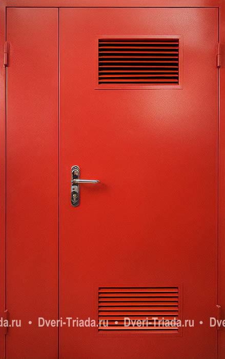 Стальная полуторная огнестойкая дверь красного цвета с жалюзийными вентиляционными решетками Арт-73